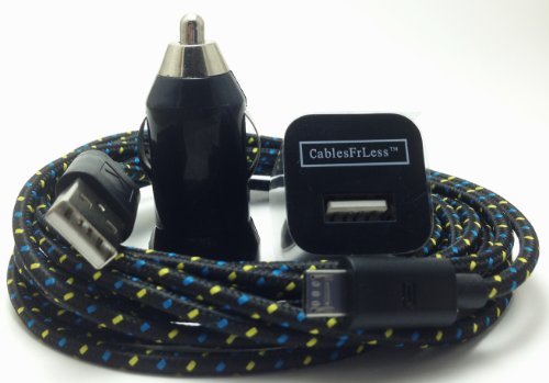 CablesFrLess (TM) 6ft Braided High Quality 3 in 1 Micro B USB Charging Set includes: (x1) USB Car Adapter. (x1) USB AC Wall Adapter with the CablesFrLess (TM) logo on the face (x1) 6ft Braided High Quality Micro B USB Charging / Data Sync Cable that fits Android Samsung Galaxy Google HTC LG Pantech Blackberry Motorola Sony ZTE etc..