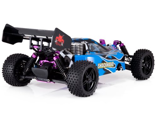 Shockwave 1/10 Scale Nitro Buggy Stun your competition with the bold Shockwave 1/10 scale. While on the track or just bashing around at home, it will handle all your off road 4-wheeled drive adventures with its powerful nitro 2.67cc Vertex engine, aluminum capped shocks, composite disc brakes. Starter kit and fuel required (sold separately).